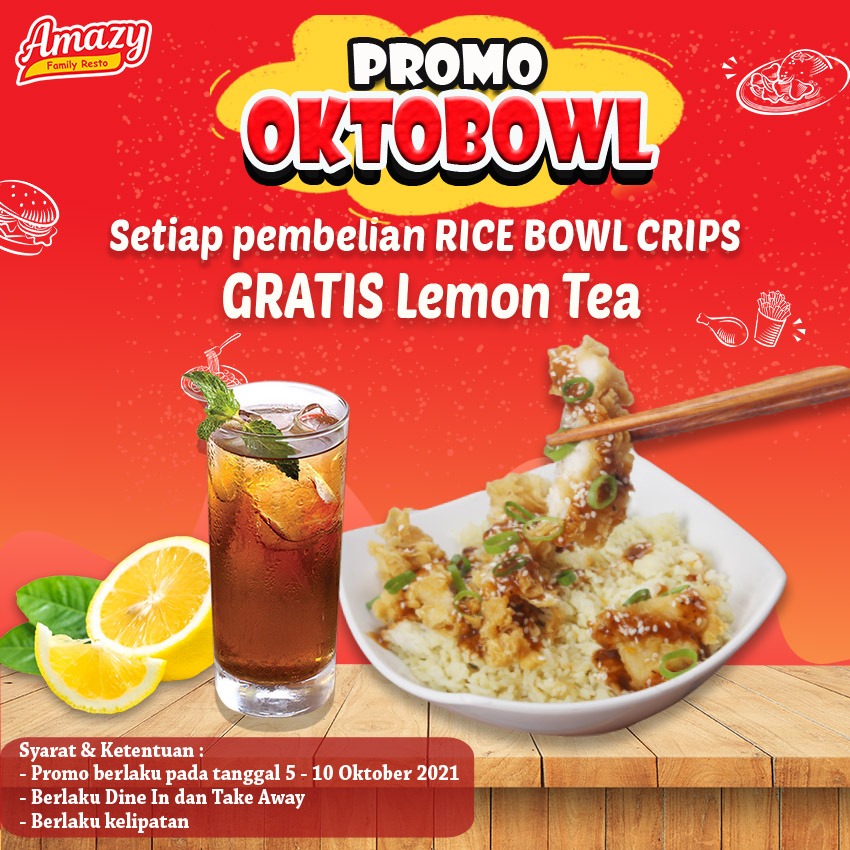 Kabar gembira buat Amazy Lovers😍 Awal bulan nikmati promo OktoBowl dari Amazy Family Resto setiap pembelian Rice Bowl Crips GRATIS Lemon Tea 🤗🤗
