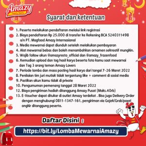 “Dengan biaya pendaftaran hanya Rp25.00,000 per anak, peserta akan mendapatkan e-voucher amazy senilai Rp10.000,00, e-sertifikat, dan media mewarnai, Banyak hadiah yang menarik.” ujar Marketing Support Magfood, Lala Jakarta,  Kamis (7/03).