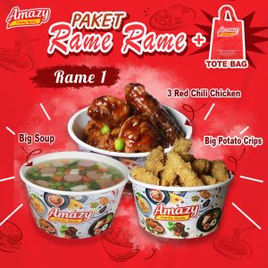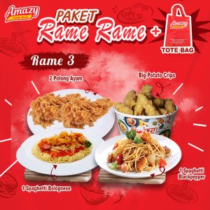 Amazy Paket Rame Rame sudah termasuk Totebag Amazy Paket 3 terdiri dari 2 potong Ayam, Big Potato Crips, 1 Spaghetti…