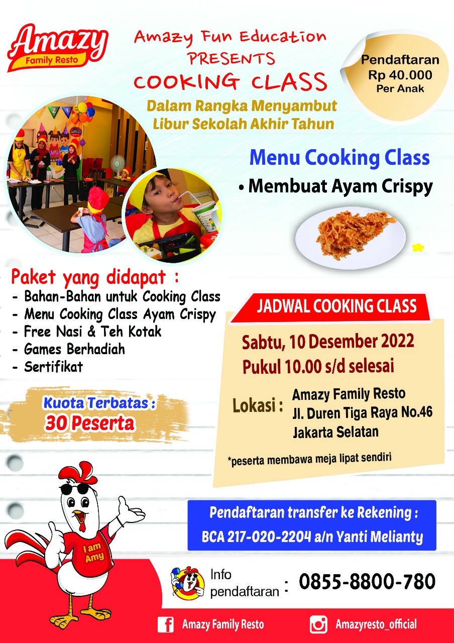 Bagi adik-adik yang penasaran gimana sih cara membuat ayam crispy? Segera mendaftar untuk mengamankan slot peserta di acara ini, karena terbatas hanya untuk 30 peserta. Acara dilaksanakan hari Sabtu, 10 Desember 2022, pukul 10.00 WIB s/d selesai. Lokasinya di Amazy Family Resto, Jalan Duren Tiga Raya No. 46 Jakarta Selatan.
