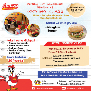 Cooking class ini akan diadakan Pukul 09.00 s.d selesai di Amazy Family Resto, tepatnya Jl. MH Thamrin No.9 Cikokol, Tangerang. Dengan biaya yang terjangkau yaitu 35 ribu rupiah saja per anak. Paket yang didapat mulai dari games berhadiah, bahan-bahan burger untuk cooking class, produk hasil cooking class yang diolah sendiri, juga sertifikat untuk semua peserta. Segara mendaftar karenavkuota terbatas hanya untuk 20 peserta.