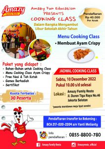 Tak ketinggalan di bulan Desember nanti, setelah sukses mengadakan cooking class yang dihadiri ratusan anak, Amazy Family Resto Duren Tiga Jakarta kembali menggelar event cooking class membuat ayam crispy dalam rangka menyambut libur sekolah akhir tahun.