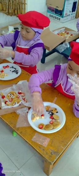 Tiba saatnya anak-anak mempraktikkan apa yang telah mereka lihat dalam demo. Dengan semangat dan kreativitas, mereka menciptakan berbagai variasi sushi bento dan pancake sesuai dengan selera dan imajinasi masing-masing. Inilah momen di mana mereka tidak hanya belajar, tetapi juga mengekspresikan kreativitas mereka dalam menghias sushi bento dan pancake.