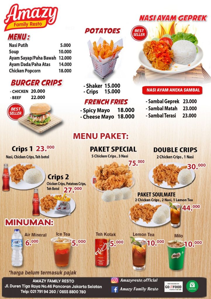 Amazy family resto bisa menjadi pilihan untuk menghabiskan waktu bersama keluarga. Selain didukung tempat yang nyaman, pilihan menu juga sangat beragam mulai dari berbagai ayam goreng, nasi goreng, rice bowl, spaghetti, burger, dan masih banyak lagi.