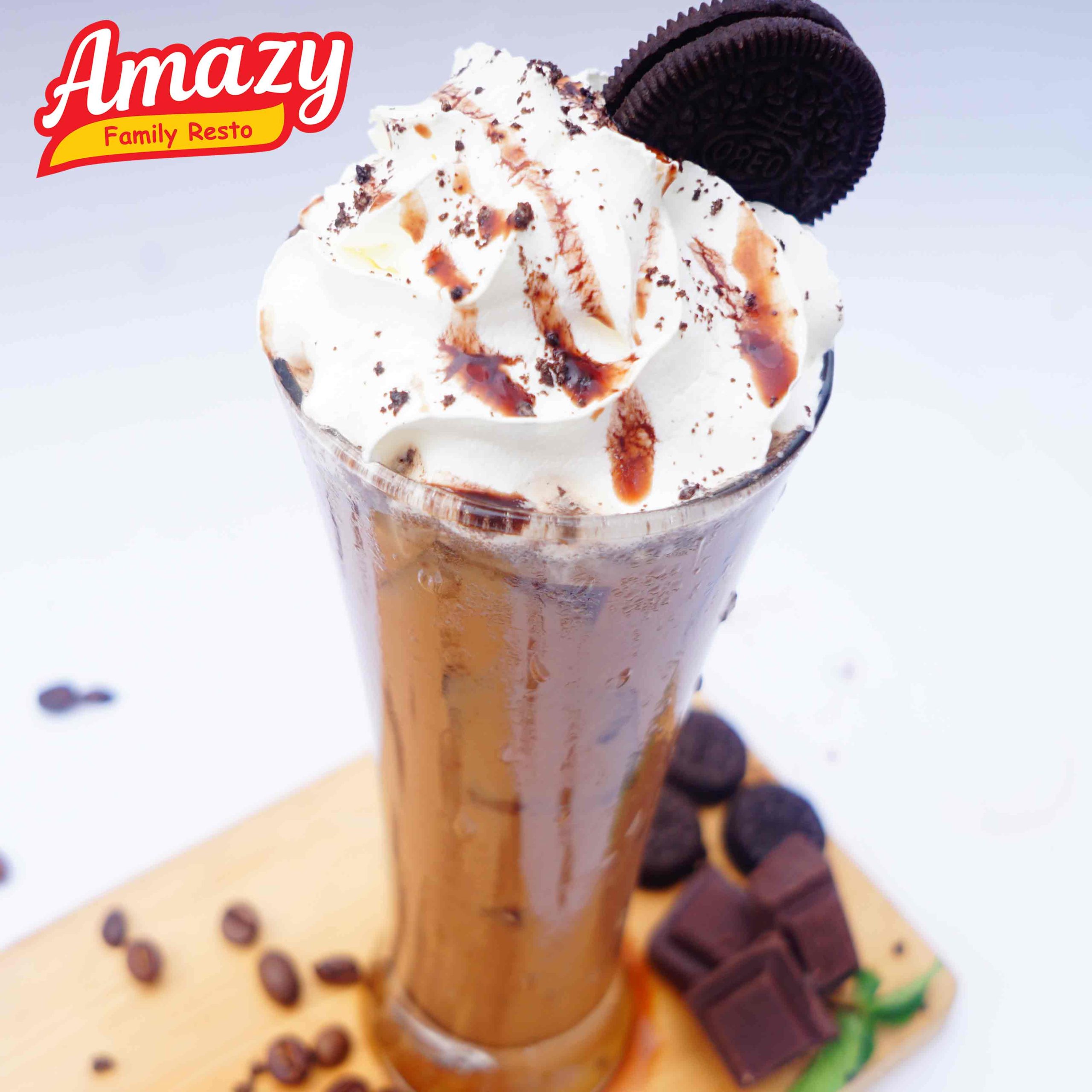 Amazy Chocolate Oreo disajikan dengan ice cokelat yang kental dengan taburan cokelat yang melimpah serta topping oreo diatasnya.