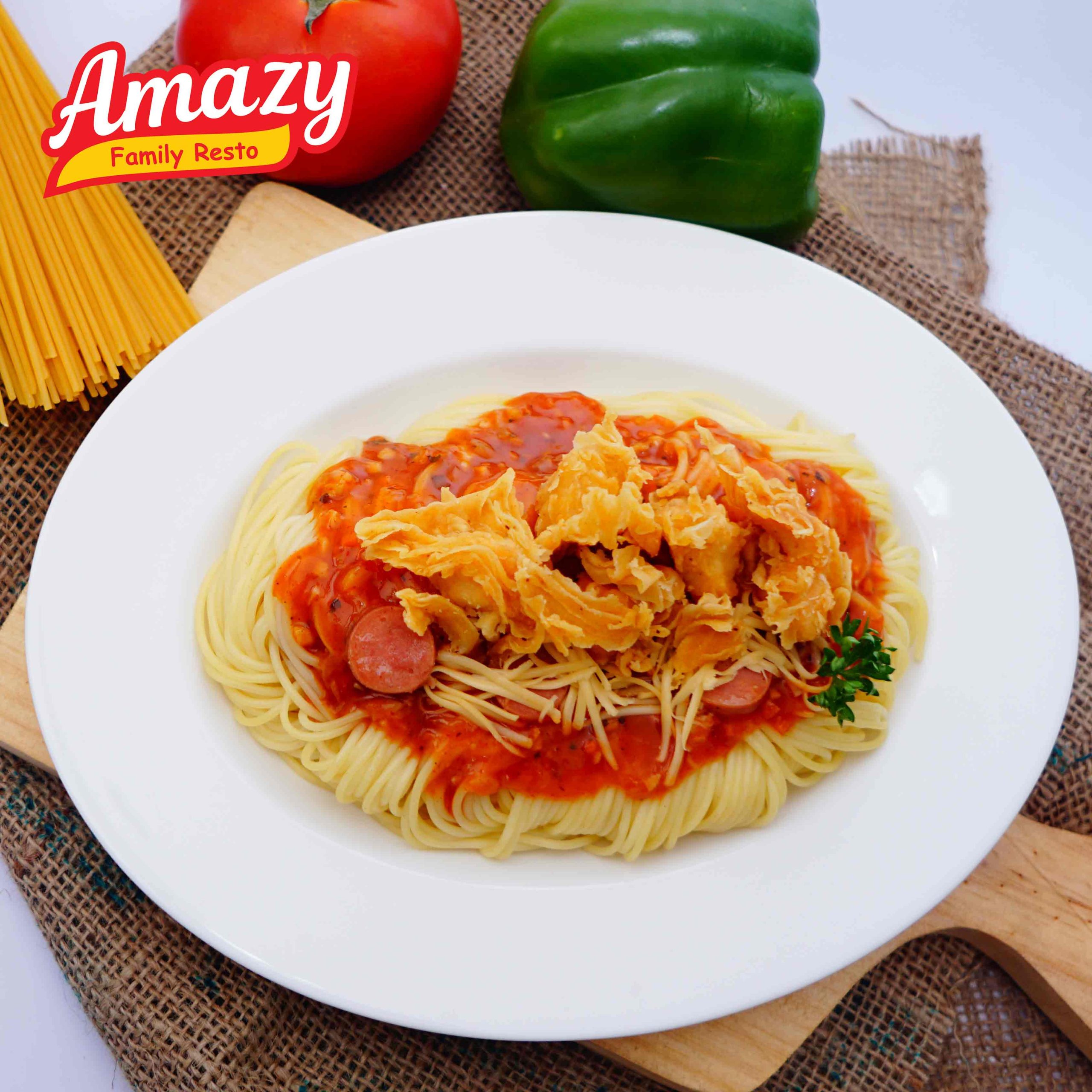 Amazy Spaghetti Bolognese disajikan dengan lezat mix vegetable ditambahkan saus bolognese yang lebih didominasi manis asam dari tomat yang berpadu dengan daging sapi dan dengan taburan keju yang gurih.
