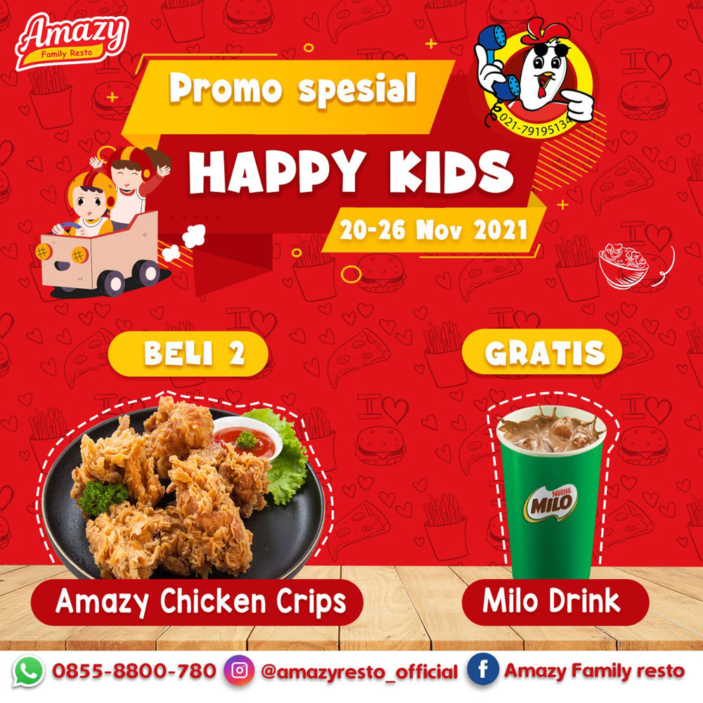 Wahhh satu lagi promo hadir nih dari Amazy Family Resto menyambut Hari Anak Nasional, kaliann bisa menikmati GRATISS 1 Milo Drink, dengan pembelian 2 Amazy Chicken Crips😍.