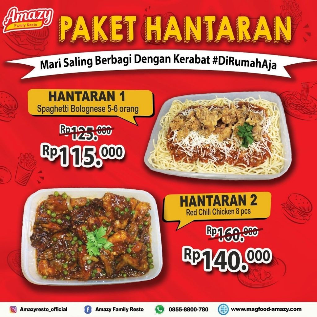 Tidak hanya pasta dan saus saja, Spaghetti Bolognese Amazy juga dilengkapi taburan keju dan topping potongan ayam. Selain spaghetti, Amazy juga punya paket hantaran Red Chili Chicken berisi 8 pcs yang cukup untuk 8 orang. Red Chili Chicken Amazy adalah ayam goreng berbalut saus pedas yang nikmat.