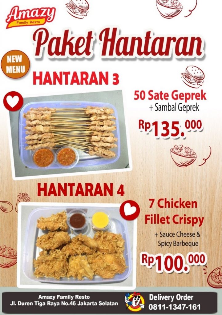 Hantaran makanan selanjutnya adalah sate geprek berisi 50 tusuk sate dengan potongan full daging yang tebal dilengkapi sambal geprek yang pedas. Kombinasi yang pas untuk meramaikan acara special Kamu. Amazy juga punya paket hantaran berisi 7 Chicken Fillet Crispy yang lengkap dengan saus cheese dan BBQ.