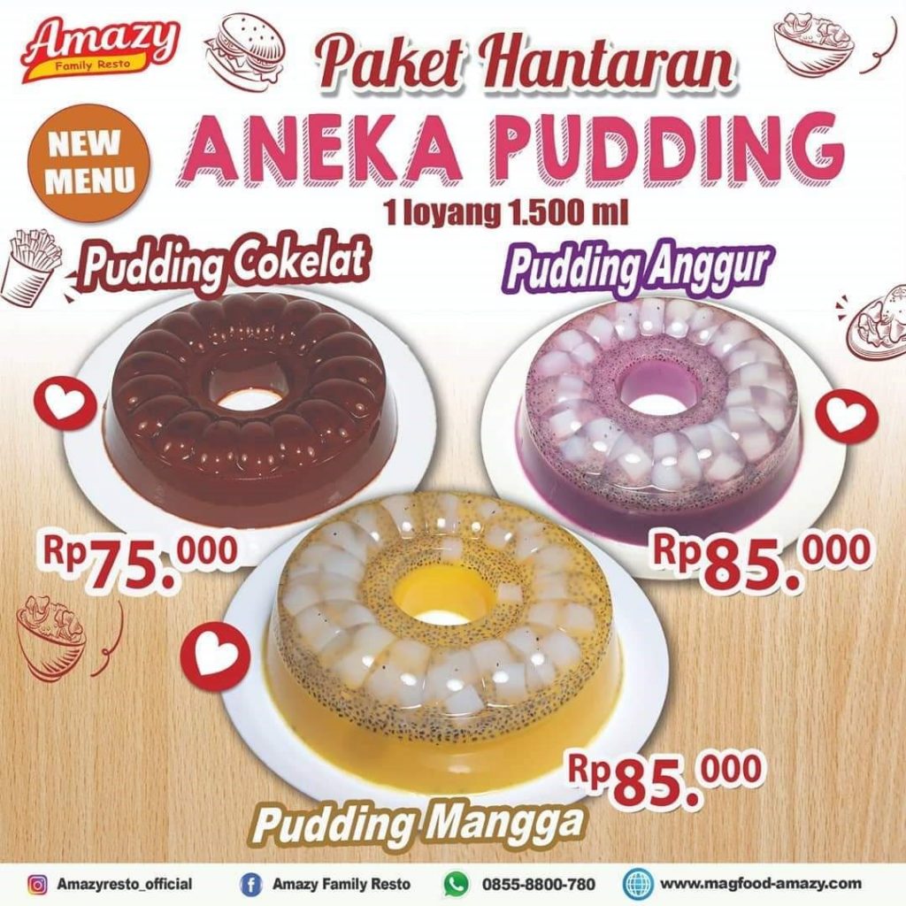 Selain tampilannya yang memanjakan mata, pudding Amazy juga memanjakan lidah dengan beragam varian rasa yaitu cokelat, anggur, dan mangga. Pudding rasa buah lengkap dengan nata de coco dan selasih yang menambah kesegaran.