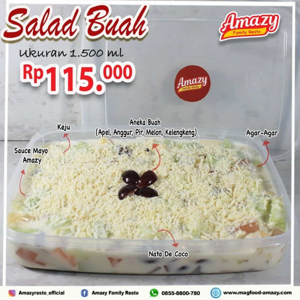 Salad buah adalah makanan yang berisi buah-buahan segar dan bahan lainnya seperti mayonnaise. Salad buah Amazy dibuat dari buah-buahan premium yaitu apel, anggur, pir, melon, dan kelengkeng. Rasa manis dan asam buah dengan gurihnya sauce Mayo Amazy adalah perpaduan sempurna. Taburan keju melimpah dan agar-agar yang menambah tekstur membuat salad buah Amazy jadi menu favorit. Jangan kaget jika salad buah Amazy langsung ludes begitu disajikan!