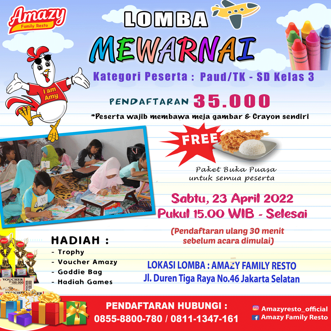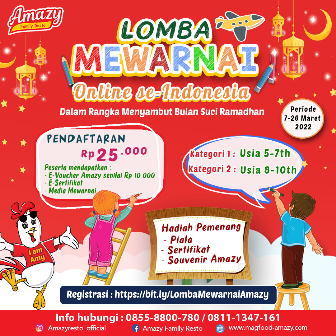 Dalam rangka ikut memperingati Hari Kemerdekaan Indonesia yang ke-77th, Amazy Family Resto kembali menggelar Lomba Mewarnai Amazy Family Resto kategori PAUD/ TK dan Sekolah Dasar (SD) kelas 1-3 bertempat di Amazy Duren Tiga No.46 Jakarta Selatan,pada Sabtu (27/8). Kegiatan lomba mewarnai ini bertujuan untuk mengembangkan kreativitas serta minat dan bakat anak. Nina Customer Service Amazy […]