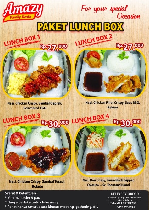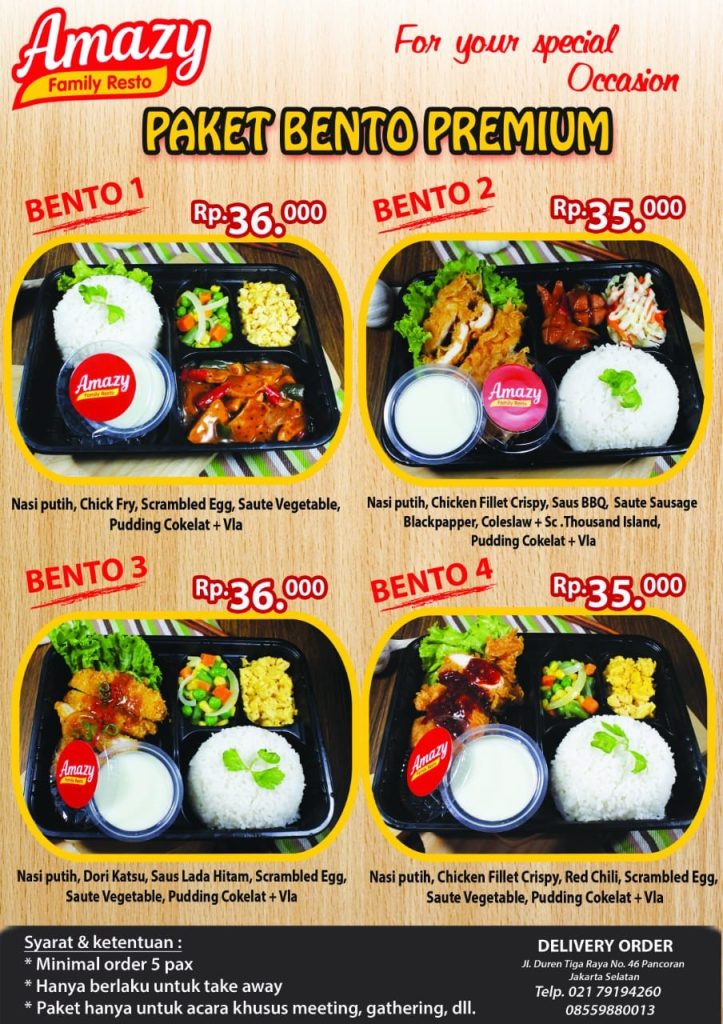Dengan harga Rp 35.000-Rp 36.000 saja, paket bento Amazy berisi menu lengkap dan tampilan yang menarik. Hidangan jadi semakin mewah!
